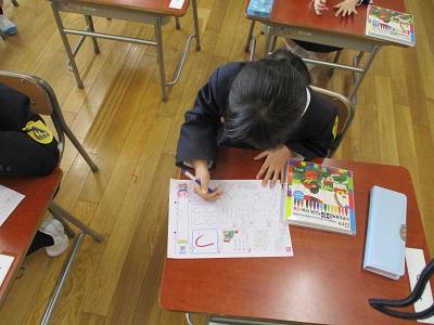 ひらがなの「つ」を書く授業では、先生の話をしっかり聴き、丁寧に書く姿が見られました。