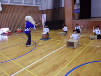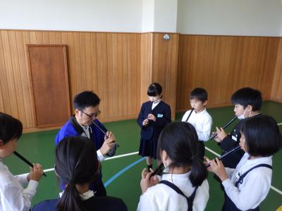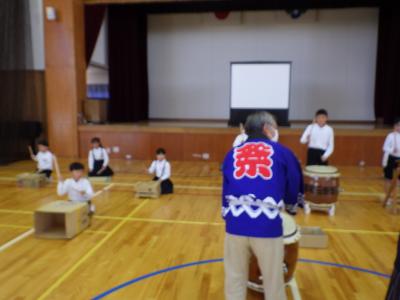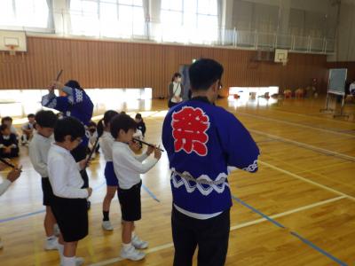 秋浜地区の5名の方々に来ていただいて、おまつり教室を開催し、まつりばやしの笛、太鼓を習いました。