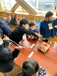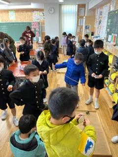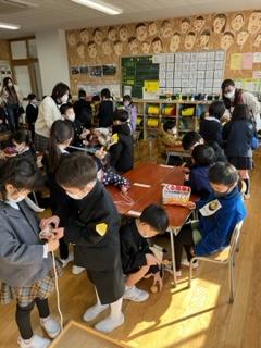 今日は、1年生の各教室で「お手玉」「独楽」「あやとり」「けん玉」の昔遊びで交流を図りました。