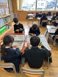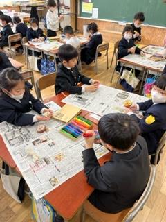 1年生が生活科の時間に、独楽の色付けを行いました。
