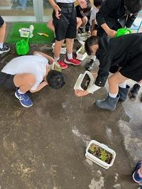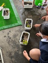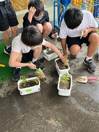 5年生が総合の時間に、フジバカマの苗の植え替えをしました。