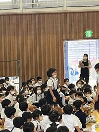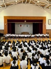 全校児童が体育館に集合し、目を輝かせながら、時には一緒に揺れながら聞いていました。