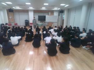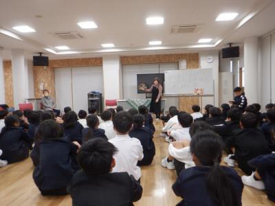 訓練後、体育館では警察官の方が学校外で不審者と出会った時の対応を教えてくださいました。