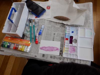 青と赤の2色を使ってサツマイモを描かなければいけないので、色の混ぜ方、水の量に苦戦していましたが、何とか思い思いのサツマイモを描くことができました。
