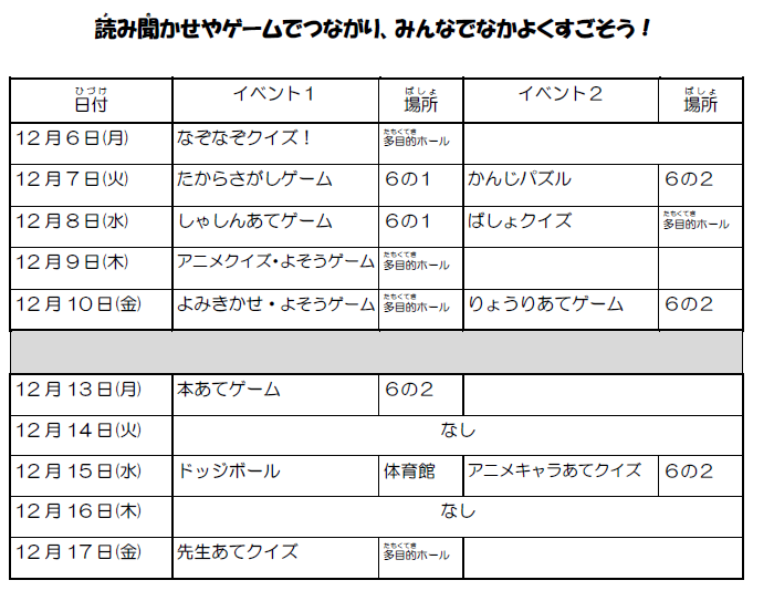 6年生児童が中心となり、冬場の遊びについて様々な企画を提案し、昨日から全校に呼び掛けて取り組んでいます。