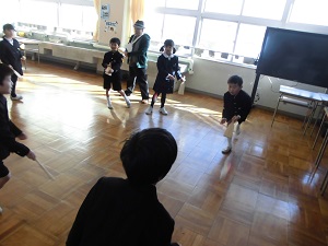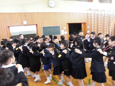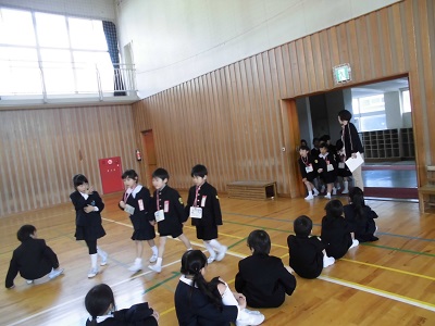 今日の1,2限目にわくわく集会をしました。2年生が迎えに来てくれて体育館へ出発!