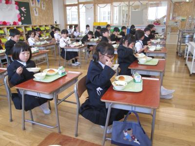 初めての給食をおいしそうに味わって食べていました。
