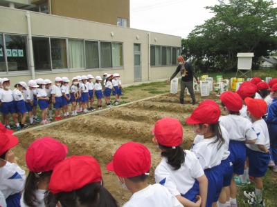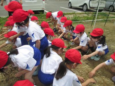 さつまいもの苗植えをしました。苗をねかせて、優しく土をかぶせていました。