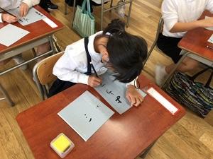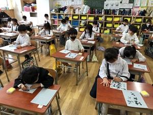 書写の時間に「水ふで」で字を書くことに挑戦しました。かわいたら字が消えてしまう紙に驚きながら、自分の名前や家族の名前、動物、果物…など、たくさんの字を書くことができました。「とめ」や「はらい」に気を付けながら上手に書いてました。