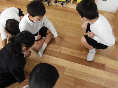 地域の方からどんぐりをたくさんいただいたので、どんぐりを使って遊びました。どんぐりごまやネックレス、かわいい人形を作っていました。どんぐりごまを作った子たちは、こま回し大会をして盛り上がっていました。「まぜて!」「いいよ」や「これおしえて!」など、子ども同士が関わり合って活動する姿が見られました。