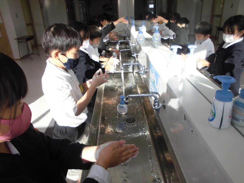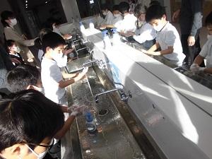 読み聞かせの後は、正しい手洗いの仕方を教わりました。「あわあわ 手洗いの歌」に合わせて、きれいに洗うこと