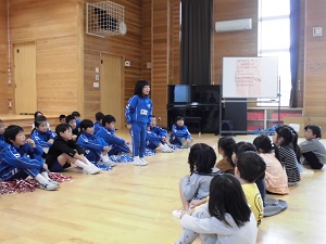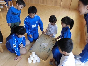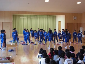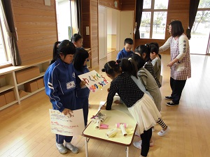 生活科では、「つくろうあそぼうくふうしよう」の授業で、身近な物を使って、作って遊べるおもちゃを作りました。今日は、ひまわり子ども園としらゆり子ども園の年長さんに楽しんでもらうために、作ったおもちゃを持って『おもちゃランド』を開きました。お兄さん、お姉さんとして、優しく年長さんに遊び方を教えてあげたり、歌やダンスを披露したりしました。