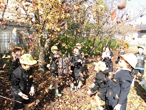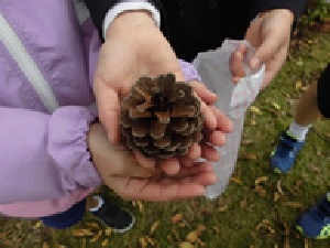 11月22日(金)にしらゆり公園へ秋見つけに出かけました。子どもたちは寒さに負けずに歩き、公園へ行く途中にもねこじゃらしや柿、コスモスなどの秋を見つけることができました。そして、公園に到着したあとにはいちょうやまつぼっくりなどを見つけることができました。たくさんの宝物を見つけることのできた秋見つけでした。