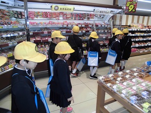 2年生は、春にも町たんけんに出かけました。春にたんけんした場所をもう一度訪れ、春と比べて、秋の木や葉っぱははどんな様子か、売っているものに違いはあるのかなどを調べました。