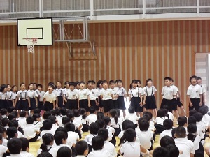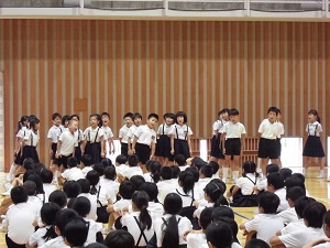 7月の全校集会で、2年生は「いっちょこ」「回文」「おまつり」の3つを発表しました。最初は速さがバラバラだったり、詩の言葉を忘れてしまったり…と難しそうな様子でしたが、練習を重ねるにつれ、だんだんみんなの心がそろってきました。