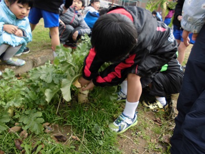 9月に植えた大根の収穫をしました。土の中から見えていた大根。もうすぐ収穫できそうだね、と楽しみにしていました。