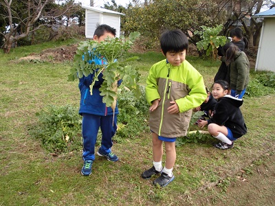 大きな大根、小さめの大根、3本足の大根など、いろいろな大根が収穫できました。みんなお家へ持ち帰りました。