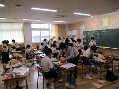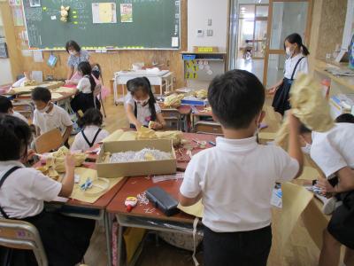 図工ではくしゃくしゃさせた袋の形から、想像して生き物を作っています。