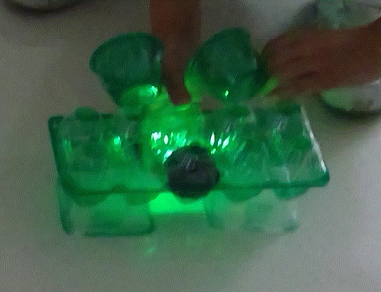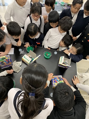 「クリスタルアニマル」では、透明なプラスチックの材料をつかって動物を作りました。完成後はLEDライトを使って照らし、作品がよりきれいになるように置き方を工夫しましたね。