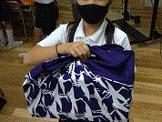 日本の伝統・文化のひとつ、「風呂敷」について学びました。ゲストティーチャーの方々をお招きし、風呂敷の包み方を教わったり、多彩な使い方についてお話を聞いたりしました。