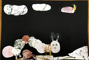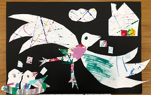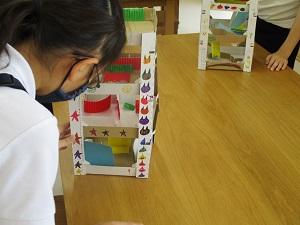2020年11月4日 08時41分図工の時間に、歯ブラシやビー玉、ストロー、段ボールを使って絵の具でもようを作りました。その紙を使ってコラージュ作品を完成させました。とてもカラフルですてきな作品がいっぱいです。