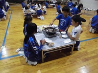 給食センターで2000人分の給食を作っていることや、そのために朝7時45分から作り始めていることを聞くと、「エー!」と驚きの声も上がりました。調理の様子を写したビデオには、「外5-1」と書かれた食缶が映ることもあり、自分達とのつながりを感じることもできました。