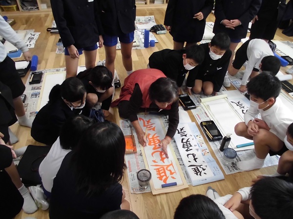 に招いて、書き初め「進む勇気」の書き方を習いました。