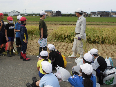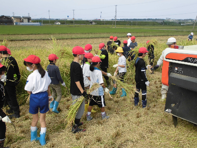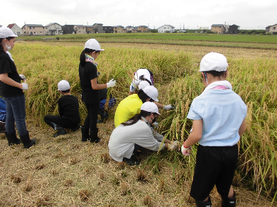 今度は稲刈り体験をさせていただきました。田植え同様、初めて稲刈りをする児童がほとんどでした。