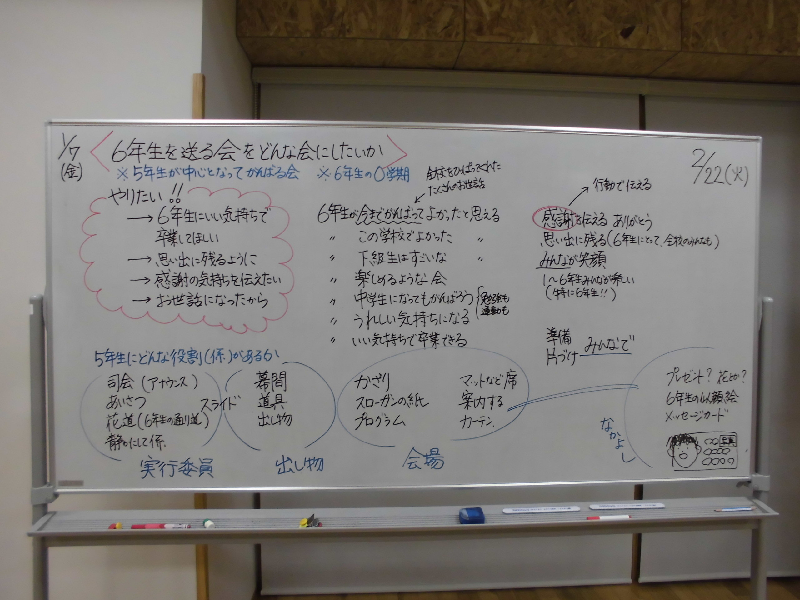 当日の流れや出し物、会場のかざり、6年生へのプレゼントなどなど…
