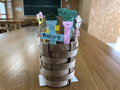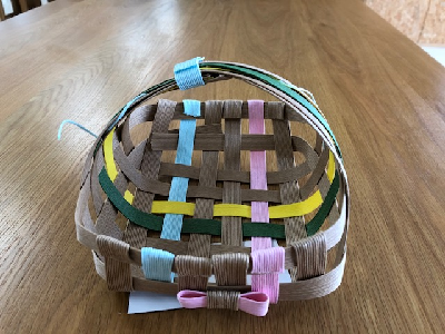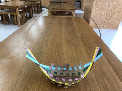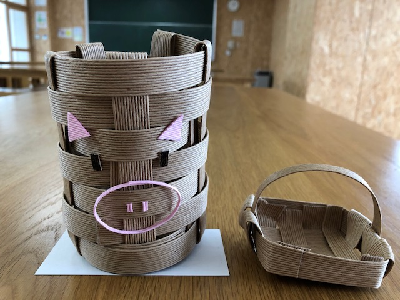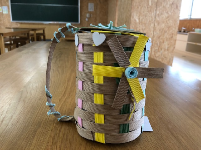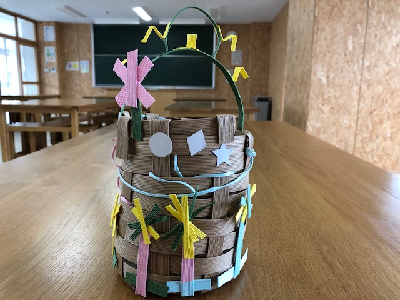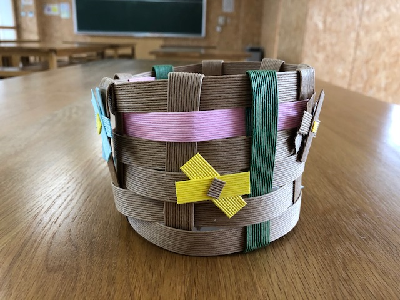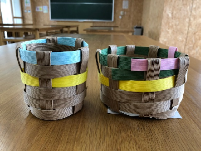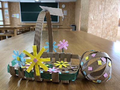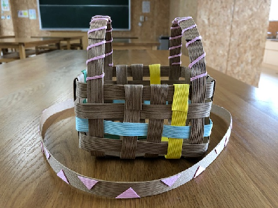 図工で紙バンドを編んでかごを作りました。誰に使ってもらおうかな、どんな物を入れようかなと