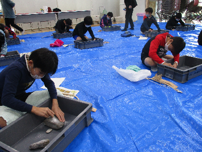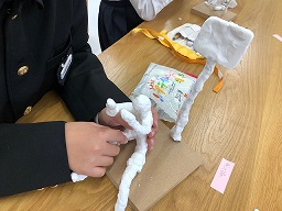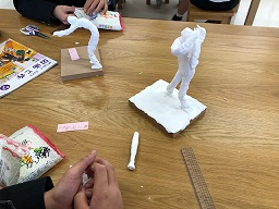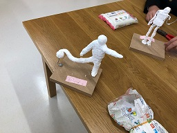 図工の授業です。先週作った骨組みに粘土をつけて、体を作っていきます。少しずつ形になってきました。