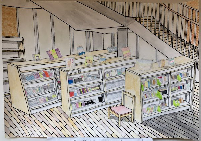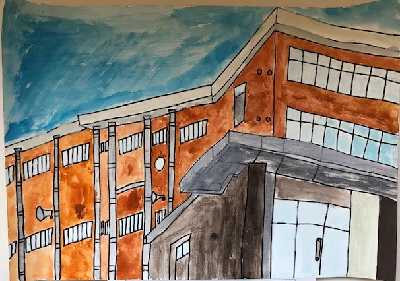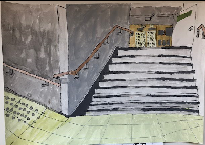 図工で校舎内の大切な風景を絵に描き始めました。奥行きをうまく表現できるように意識しています。