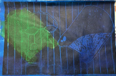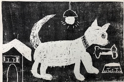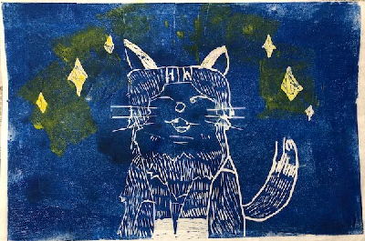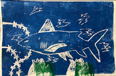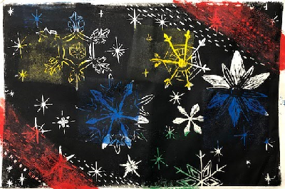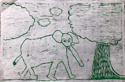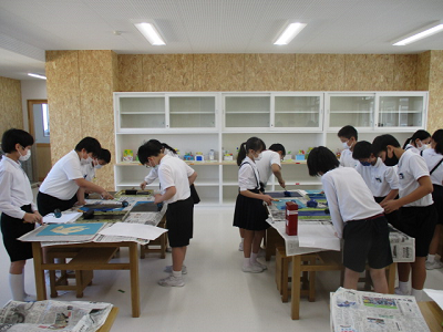 図工の時間です。版画の制作に取り組み、すてきな作品が出来上がりました。