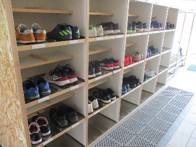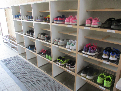 昼休み後の下駄箱です。どちらのクラスも、かかとを揃えてズックを入れることが