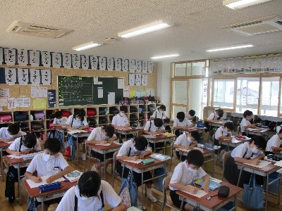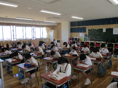 算数の授業です。授業の最初に、100マス計算をしています。基礎・基本の計算を速く、正確に