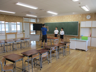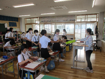 音楽の授業です。音楽を聴いて感じたことを発表しています。