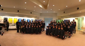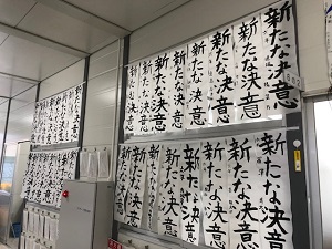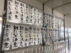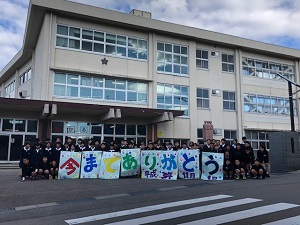 灯台セレモニーの後、学校に帰ってから、「校舎に感謝の気持ちを伝えよう」ということで、数日前から一人一人の手形に名前を書き、横断幕のようにして感謝を伝えました。校舎の解体工事は今月中旬より実施…。