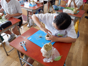 お話を聞きました。その後、土器づくり体験ということで、弥生土器づくりに取り組みました。