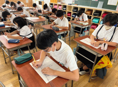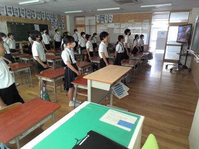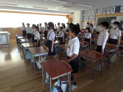 7月24日(月)、終業式がありました。校歌を歌い、校長先生から「安心・安全」「あいさつ」「協力」の大切さについてのお話や、平和についてのお話をしていただいたり、成長した点についてふり返ったりしました。成長した点を自覚し、自信にしながらさらなる目標を見つけ、2学期も頑張っていきたいですね。生活に関するお話では、規則正しく健康に過ごすことや、安全にトラブルなく過ごすことの大切さについて改めて確認しました。