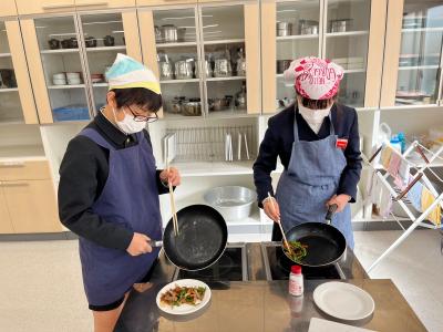 11月、家庭科の授業にて調理実習を行い、野菜炒めを作りました。クラスの半数ずつで入れ替わり、感染対策を講じながら行いました。玉ねぎ、人参、ピーマンやハムといった食材を包丁で切り、味付けをして炒めました。