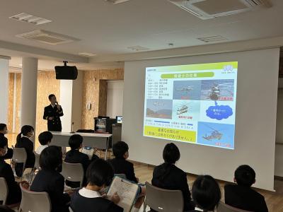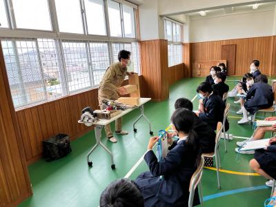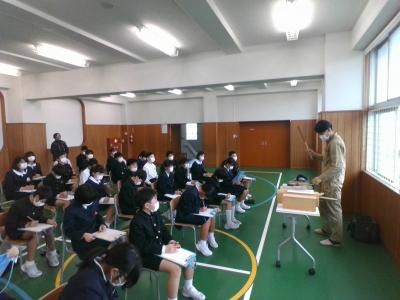 11月28日(月)にキャリア教育の一環としてゲストティーチャーを招き、職業について学びました。今回は「自衛隊」の職について、青木所長に来校いただき具体的な仕事内容や目的などについて教えていただきました。自衛隊の方々によるパトロールや訓練によって日本の平和と独立が守られたり、災害時に派遣して対応・支援してもらったり、国際貢献活動に取り組んでもらったりして、我が国を支えてもらっているんだということが改めてわかったのではないでしょうか。