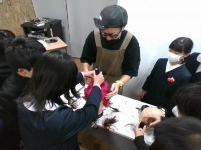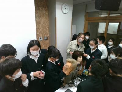 12月5日(月)、「美容師(床屋)」の職について、川原さん、山口さんに来校いただき、どのようにして美容師になることができるかや職業のやりがいと大変さなどについて教えていただいたり、メイクやヘアアイロン、バリカン体験などをさせていただいたりしました。貴重、かつ楽しい体験をさせていただき、「一生この授業したい!」という声まで聞こえてきました。目を輝かせながら体験を行う皆さんのキラキラした表情が印象的でした。今日の体験を通して、自分の中で視野や世界が広がった人も多かったのではないでしょうか。