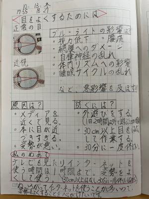 視力検査がありました。視力を検査する前に、保健の先生から視力が低下するメカニズムについてのお話をしてもらいました。視力を低下させないために、30分目を使ったら休憩を取ったり、読書やパソコンを使う際に30㎝以上離して使ったり、スマホなどを使いすぎないように時間を決めたりなど、それぞれ個人でめあてをもちましたね。学校はもちろん、家庭でもスマホやパソコン、テレビとの付き合い方に気を付けて生活しましょう。