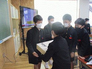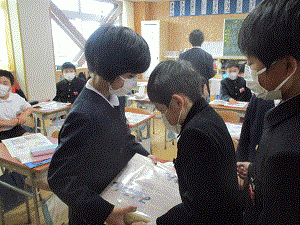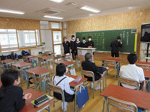 図書担当の先生より、今年度の課題図書4冊についてブックトークをしてもらいました。今年度の課題図書は「りんごの木を植えて」「風の神送れよ」「僕の弱虫をなおすには」「捨てないパン屋の挑戦」です。登場人物たちの闘病生活や地域の伝統行事への参加、外国への旅などの体験を通して命の大切さや友情、環境問題、責任感といったテーマについて考えることができるということを、ブックトークを通して学ぶことができました。読書感想文を書くモチベーションも上がったのではないでしょうか。