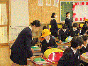 入学したてで不安な1年生をサポートするため、登校後、玄関や教室で声をかける6年生。下駄箱の場所やくつの入れ方を教えたり、ランドセルのしまい方、提出物の出し方などを教えたり手伝ったりしていました。12日以降は給食も始まったため、準備や片付けのお手伝いも行いました。最高学年らしい姿が見られ、素敵だと感じました。