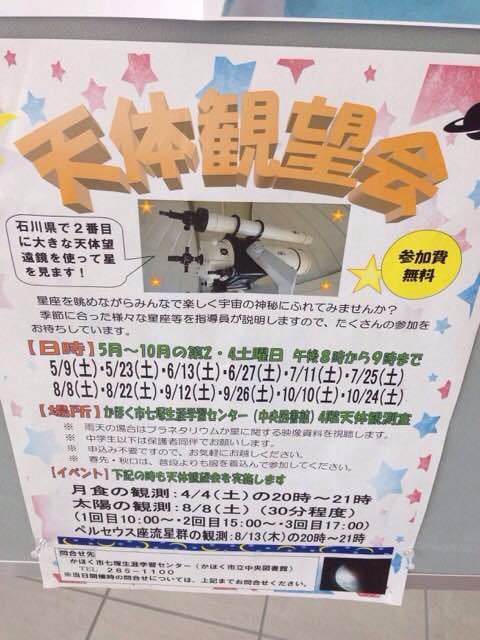 場所は生涯学習センター(かほく市中央図書館)最上階にある望遠鏡のお部屋。