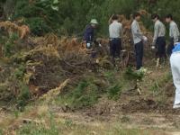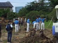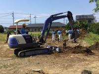 前庭では、環境科学コース(環境設計分野)の生徒たちが伐採後の切株や根を建機やスコップで掘り起こしていました。奥には造園分野の生徒が伐採した木々を細断・整理し、搬出していました。
