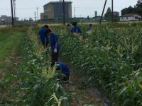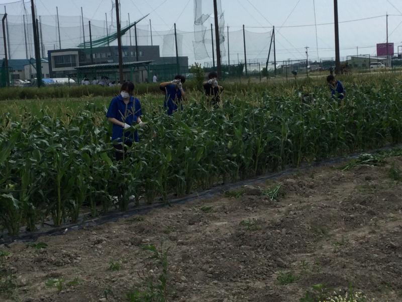 農場では、生物資源コースの生徒が、トウモロコシ畑で除草を行っており、収穫に向けて養分が雑草に取られないよう丁寧に作業していました。
