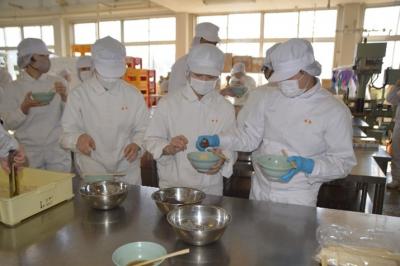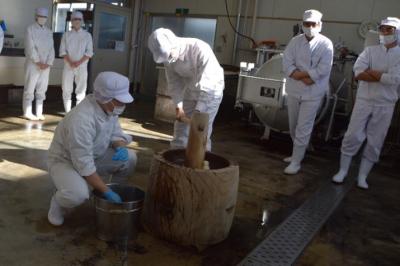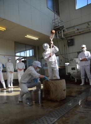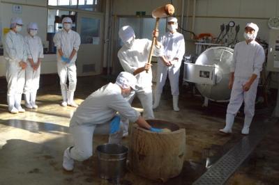 今日は、恒例の食品科学コース3年生の最後の実習「餅つき」が行われました。