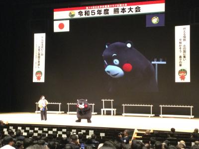 26日に熊本城ホールで開催された大会式典では、人気キャラクター「くまモン」が、ステージ狭しと動き回り、会場は大盛り上がりでした。